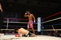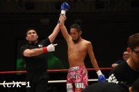 「(試合を振り返って?)いやあ、勝てて安心しました、本当に。(ここで寺崎選手がおめでとう』と声をかける)寺崎さん、ありがとうございました!最近は連敗続きで応援とかも減っちゃって。KOできたので、ここからまた頑張って勝ち上がっていきたいと思ってます。(対戦相手の印象は?)僕が言うのもヘンな話なんですけど、本当にすばらしい、人間ができている方なので。ああいう人になりたいな、と。そういう人と殴り合うのも、格闘技の魅力なんじゃないかな、と。試合が本当に楽しかったです。ありがとうございます。(今後の目標は?)寺崎選手もメッチャ格好いい人なんですけど、今回はその寺崎選手と戦った松下大紀っていうのも、子どもたちに格好いいなって思ってもらえると思うので。そういう今まで倒してきた人とか、ああいう寺崎さんと拳で語った気持ちとかを、自分が体現して上に上がっていきたいと思います」