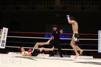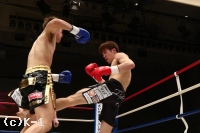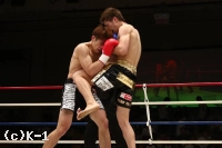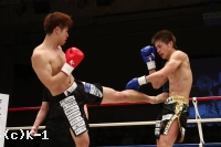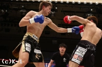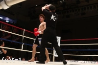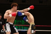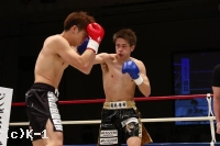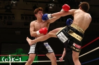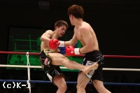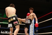 2R、やや劣勢だった佐野は意識して前に出る。だが、鈴木はこれをプッシングで押し返し、右ストレート、左フック、ヒザと打ち込む。佐野は距離を詰めさせないようにし、右ローを蓄積させていく。鈴木は足が効いてきたか、ラウンド中盤からやや前進が鈍ってくる。だが、鈴木はラウンド後半プレスを強め、左フック&右ショートストレート、ヒザ蹴りで佐野を攻める。