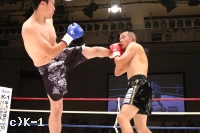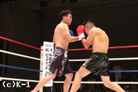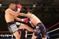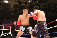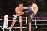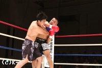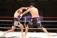3R、このラウンドも前に出てくるヨースケ。冨沢はヨースケの動きに慣れてきたか、横に回って巧みにさばき、ヨースケにジャブを入れる。ヨースケをプッシングして下がらせ、ロープに追い込みジャブとボディへのヒザを入れる冨沢。前に出ようとするヨースケだが、冨沢に対し圧力を利かせられなくなっている。ヨースケの前進を横にかわし、逆にジャブ・ボディへのヒザで攻める冨沢。ラウンド最後はヨースケを下がらせて試合を終える。