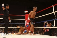 1R、サウスポーの小澤が前蹴りと左ミドル。林も右ミドル・右ハイキックを蹴ってパンチで前に出るが、そこに小澤がカウンターの右フック。これで林が下がり、小澤が追いかけるような右フックでダウンを奪う。再開後、一気にパンチで襲いかかる小澤が左の飛びヒザ蹴り。これで林をなぎ倒し、2試合連続のKO勝利でリーグ戦首位の座をキープした。(小澤=勝ち点8、林=勝ち点1)