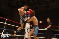 1R、ジャブを突いて前に出ていく戸邊。堀尾は距離を取りながら、前蹴りと左ミドルを蹴る。戸邊も右ローを蹴り返し、プレッシャーをかける。堀尾は細かくパンチをまとめてヒザ蹴り。戸邊はジャブと右ローを当てて前に出ていくが、堀尾が飛びヒザ蹴りを一閃。これで戸邊の腰が落ち、堀尾がパンチとヒザ蹴りで猛ラッシュ。戸邊はガードを固めて、堀尾の猛攻を必死に凌ぐ。