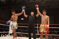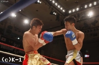 3R、パンチで前に出ていく林。伊藤も左フックとヒザ蹴りで前に出て、左ミドルでボディを狙う。お互いに距離を止めて打ち合う展開となり、伊藤が左ハイキックと飛びヒザ蹴り、林も左右のフックを叩き込む。判定はジャッジ1名が伊藤を支持したものの、残り2名は差をつけず。勝ち点1ずつを分け合う結果に終わった。(伊藤=勝ち点1、林=勝ち点1)