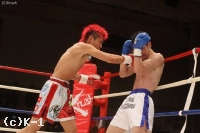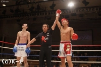 2R、ここも飛翔がガードを上げて前に出てローを蹴る。荒木は距離を取りながら前蹴りと左ミドル、細かいパンチのコンビネーションからハイキックにつなげる。飛翔は構わず前に出て飛びヒザ蹴り、右フックと右アッパーを当て、右ストレートから左フックを当てる。終盤、飛翔は荒木をロープまで詰めて左フックをヒットさせた。