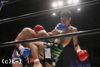 3R、早坂が左ストレートと左ミドル、前田も必死にパンチを返す。左ストレート、ヒザ蹴り、左ミドルで手数を増やす早坂。左ミドルで前田の体が「く」の字に折れ曲がるが、タフな前田は倒れない。2Rにダウンを奪われたものの、終始攻め続けた早坂が判定勝利した。