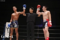 3RはMANがパンチで前進。林が距離を取りながら左ミドルと奥足ローを蹴る。MANはガードを固めて前に出て右ローとワンツー、林はMANのジャブに右フックをかぶせる。細かい連打で林をロープに詰めるMANだったが、林が左フックでぐらつかせてパンチをまとめる。そのまま林がMANをコーナーに詰めて一方的に攻め込むが、終了直前にMANが起死回生の右ストレートでダウンを奪う。これでMANがポイントをイーブンに戻し、ドローに終わった。