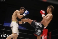 1R、サウスポーの東本に対して、平塚もサウスポーに構えて右のインロー。東本は平塚の蹴りに左ストレートを狙う。じりじりとプレッシャーをかける平塚は左右のミドルと左ロー、東本はそこに左ストレートを狙う。平塚は右ボディから左フック、東本が前蹴りを蹴ると、すぐさま左ローを蹴り返す。