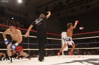 1R、いきなり距離を詰めていく北井。渡辺は左ミドルで距離を取って右ストレートを狙う。北井も前蹴りと右ストレートで前に出るが、距離が詰まると渡辺は左ボディとヒザ蹴り。プレッシャーをかける北井はヒザ蹴りから右ストレート、これを効かせて連打を打ち込んでダウンを奪う。