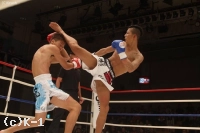 2R、ガードを上げて前に出る亀本が左ミドルとロー。岩尾は左右に動いてパンチをまとめる。左右のボディブロー、飛びヒザ蹴りをを出す岩尾。亀本も左ミドルと左ローで前進、岩尾は下がりながら右ミドルを蹴る。