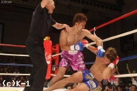 1R開始直後、寺崎が右フックを強振。これでHIROYAをぐらつかせると、HIROYAをコーナーに詰めて一気にパンチを連打する。何とかパンチとヒザ蹴りを返すHIROYAだったが、寺崎が右ストレートを打ち抜いてダウンを奪う。立ち上がったHIROYAに寺崎は猛攻。再び右ストレートからの連打でダウンを奪うと、レフェリーが試合をストップ。寺崎が下馬評を覆すKO勝利でKrushのベルトを腰に巻いた。
