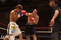 2R、パンチで前に出る沙斗流。良輝は奥足ローを蹴って、左ハイキック、飛びヒザ蹴りにつなげる。このラウンドも沙斗流がパンチで前に出て、良輝がローを蹴る展開が続いた。