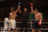 3R、沙斗流が一気に連打で前に出ていく。良輝もパンチとヒザ蹴りで応戦、トリッキーな蹴り技を繰り出すが、沙斗流の前進は止まらない。最後まで沙斗流がパンチ、良輝がローで打ち合う展開となり、判定はドローとなった。