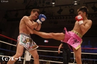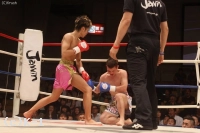 2R、右フックを強振する獅子丸。西京はボディに左ミドルを蹴り込むと、左ボディストレート、奥足ロー、ハイキック、左ストレートと攻撃を散らす。下がる獅子丸にパンチとヒザ蹴りで襲いかかり、最後は前蹴りを突き刺してダウンを奪う。再開後、ガードを固める獅子丸をパンチ、ヒザ蹴り、ローで攻め込む西京。2度のダウンを追加し、見事なKO勝利でプロデビュー戦を飾った。