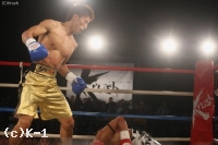 2R、ガードを上げてパンチで前に出ていくBro.RYO。鈴木をコーナーに追いつめると、強烈な左フックでダウンを奪う。何とか立ち上がる鈴木だったが、足元がぐらつき、レフェリーが試合をストップ。Bro.RYOが見事なKO勝利を収めた。