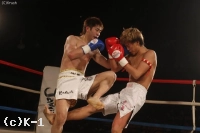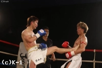 2R、Shi-moが左フックから右ロー。佐野は確実に右ローを蹴り返し、ヒザ蹴りでボディを狙う。Shi-moは佐野のブロックの間を狙って右アッパー、佐野は左右のローを蹴り続ける。そして終了間際、佐野がShi-moのパンチに右の飛びヒザ蹴りを合わせ、ダウンを奪う。