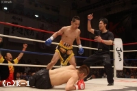 2R、板橋が大月のミドルに左ミドルを合わせて距離を詰める。ロープを背負う大月にヒザ蹴りを突き上げる板橋。ここからパンチの打ち合いになると、大月が左フックを叩き込んでダウンを奪う。しかし立ち上がった板橋は左ストレート左フックで猛反撃。ダウンのダメージを感じさせない動きで大月を追い込み、パンチとヒザ蹴りで大月を下がらせる。