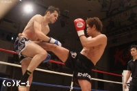 2R、真弘が強烈な左ミドル、細かくフェイントを入れて前に出る。アジャウィーは前蹴りとバックブロー、距離が詰まるとクリンチで追撃を阻止する。真弘はじりじりと前に出て左ミドルとインロー、アジャウィーはヒザ蹴りとパンチで迎え撃つ。真弘も左フックを打ち込むが、アジャウィーはひるまない。