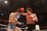 1R、サウがスポーの真弘が細かくフェイントを入れてインローと左ミドル。パンチをまとめてインローを蹴ると、これがローブローとなり試合が一時中断となる。再開後、アジャウィーはパンチからヒザ蹴り、ハイキックを蹴る。真弘はじりじりとプレッシャーをかけてインローと奥足ロー、アジャウィーも右ヒザ蹴りから右ストレートを打つ。