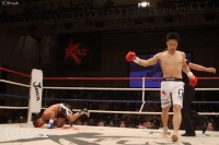1R、富平がインローと左ミドルを蹴って、栗原に距離を詰めさせない。そして栗原のブロックの間にジャブを打ち込むと強烈な右ストレート。この一発で富平をマットに沈め、豪快なKO勝利を収めた。
