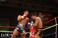 2R、林は左ミドルと右ロー。大野はパワフルなパンチで前に出る。さらに大野は右ボディから顔面の左フック、林をコーナーに詰めて連打をまとめる。林も右ストレートから前に出て右のヒザ蹴り。左フックで大野の足を止めるとパンチの手数を増やす。