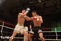 1R、サウスポーの板橋がインローと左ボディ。小川はインローと右ミドルを返す。板橋は左ミドルと左ストレート、距離が詰まるとボディを叩く。右アッパーから左ストレートを伸ばす板橋。小川は前に出ながら左右のミドル、右ハイキックを狙う。板橋が左ストレートとヒザ蹴り。小川もヒザ蹴りを返す。終盤、板橋が左ストレートと右フック。密着する小川に左フックを当てる。