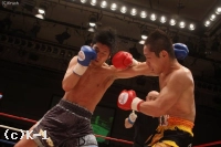3R、青津が左フックで大月の動きを止める。さらに青津は右ストレートから左ミドル、左アッパーから右ストレートと手数を増やす。しかし大月も必死にパンチを返して反撃。右フックで青津のバランスを崩し、ロープに詰めて連打をまとめる。意地の青津もヒザ蹴りからパンチで前に出る。本戦の判定は30-30、29-29、29-29と差がつかず、延長戦へ。