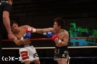 2R、鎌田が回り込むような右フックと右ロー。隆聖は距離を潰して右アッパーと右のヒザ蹴り。下がる鎌田に右フックを当てると飛びヒザ蹴りを発射。鎌田も打ち合いの中で右のパンチを叩き込んで反撃する。