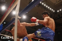 1R、宮越は小刻みに動いて右ストレート、右ミドル、インローと前に出る。功也もジャブを打ちながら左ストレートを顔面とボディに打ち分ける。