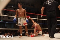 2R、ワンツーで前に出ていく弘嵩。梶原もジャブを当てて右ストレート、パンチを返していく。徐々に両者とも手数が増えるなか、弘嵩は左ハイキック。しかし梶原もワンツー、そして右ストレートを二発。これで弘嵩がバランスを崩し、レフェリーはダウンを宣告する。再開後、弘嵩はすぐに左フック、右ストレートで突進。梶原も右のカウンターを当ててヒザ蹴りにつなげる。