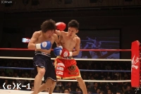 1R、サウスポーの瀧谷に対して、沙斗流がじりじりと前に出ていく。瀧他は奥足へのローを蹴って顔面前蹴り、左ストレートと右フックを打ち込む。沙斗流も右ストレートで前進、瀧谷をロープまで押し込む。距離をとった瀧谷は左ストレートと左右ハイキックを飛ばす。