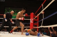 トッチも何とか立ち上がったが、再開後、板橋は左ボディから顔面に連打をまとめてダウンを追加。最後は左のヒザ蹴りでトッチをマットに沈めた。王者としてきっちりKO勝利を収めた板橋だったが「ちょっと自分の中ではもう少しやりたかったんですけど…次、次に期待してください」と締めた。