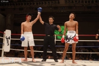3R、距離を潰してパンチで突進する濱田が右フックで佐野をぐらつかせる。さらにコーナーでガードを固める佐野に連打を打ち込み続けるが、佐野も必死にヒザ蹴りで反撃。佐野がヒザ蹴りの連打でダウンを奪い、勝利をもぎとった。