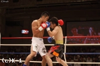 3R、パンチのフェイントからローを蹴る渡辺。そこからパンチで前に出ていくが、後藤が右フックを当てて攻め込む。さらに後藤は左ミドル、バックキックと手数を増やす。ここで後藤が左目尻をカットし、ドクターチェックが入る。