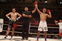再開後、先にパンチで出ていくのは渡辺。後藤のローに左ックを合わせる。後藤もジャブを突いて右フック、左ローと左ミドルを当てる。最後まで打ち合う両者だったが、判定は後藤に軍配が上がった。
