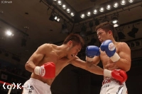 1R、細かくジャブを突く大滝。鈴木もジャブを返してヒザ蹴り、右フックを当てて一気に前に出る。大滝がジャブとローを小刻みに当てると、鈴木も右のパンチから左のヒザ蹴り。細かく動いて手数の多さで攻める大滝に重い攻撃で対抗する鈴木という展開が続いた。