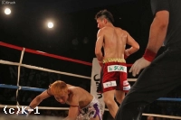 2R、左ボディから飛び込む琢磨。北井も右ストレートを打ち下ろす。琢磨はジャブ、右ストレートで前進。北井は下がりながら左ミドルと左フックを当てる。北井がパンチから左のヒザ蹴り、琢磨もそこに左フックを狙う。しかし北井が左フックのカウンターを合わせて、そこから左右の連打。これで北井が先制のダウンを奪う。再開後、右ストレートで突進する北井。琢磨も右ストレートで反撃。距離を潰した北井がヒザ蹴りを突き刺す。