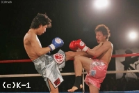 2R、林がパンチとヒザ蹴りで突進。左フックから右ストレート、ロー・ミドルと蹴りにもつなげる。貴章もボディ打ちと右フックを当てて反撃、両者はロープ際で激しくパンチで打ち合う。