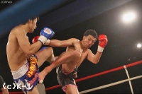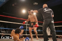 2R、NOMANがプレッシャーをかけて右ミドルとロー、右ボディを打ち込む。必死に左ミドルを蹴っていく原だが、NOMANが距離を詰めてボディ打ち。左ボディを当てると、そこからヒザ蹴りにつなげてダウンを奪う。