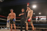 3R、SHO-YAは距離を取りながら左ミドル、そこから左ボディで飛び込んでヒザ蹴りにつなげる。さらにSHO-YAは顔面に左フックを返す。塙も踏ん張りボディを打ち返し、最後はお互い死力を尽くして打ち合う。1Rにダウンを奪った塙が判定で勝利を収めた。