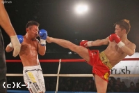 3Rに入っても手数が減らない水嶋。翔太はパンチから奥足ローにつなげると、ついに水嶋がバランスを崩す。必死に奥足ローを蹴る翔太。水嶋も踏ん張って左ストレートと右フックで前に出る。1Rにダウンを奪い、ローを効かせた翔太が判定勝利を収めた。