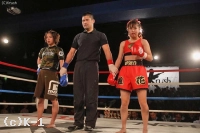 3R、足を止めずに左ミドルを当てていくChihiro。楓花がパンチで詰めても左ミドル、右フックで応戦するが、ブレイク後に気を抜いたところに楓花が左フックをヒット。判定はジャッジ1名が楓花を支持したもの、残り2名はイーブンとしてドローに終わった。