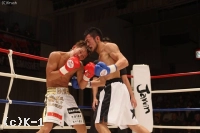 2R、皇治の左ミドルに神戸が右ストレート。皇治も飛び込むような右ストレートを返す。神戸は皇治の右ハイキックをブロックして左ボディ、右ボディからパンチをまとめる。神戸はパンチで前に出てヒザ蹴り、そしてボディ打ち。皇治はヒザ蹴りのカウンターを狙う。