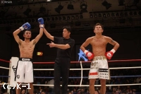 3R、神戸が左ボディからパンチで前に出る。皇治も左フックを返してパンチから飛びヒザ蹴りへ。神戸は距離を潰して左ボディと顔面への左フック。皇治も右のパンチを返してヒザ蹴り。神戸がボディを中心にパンチで攻めれば、皇治はパンチとヒザ蹴りで攻撃を返す。残り30秒、激しく打ち合う両者だが、試合終了のゴングを聞く。