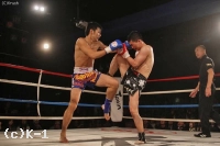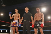 3R、原が前蹴りで明戸を突き離して左ミドル。明戸が前に出てくるところに左ストレートを当てる。原は明戸をロープまで詰めてパンチから左ミドルと左のヒザ蹴り。最後まで攻め続けた原が文句なしの判定勝利を収めた。
