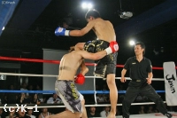 3R、ここもパンチで突っ込むコーキ。そこにヒザ蹴りを合わせる近藤という展開が続く。ここで近藤の左ハイキックがコーキの顔面をとらえ、そこから近藤が左の飛びヒザ蹴り! これでコーキがバランスを崩し、レフェリーはダウンを宣告する。しかし先にダウンを奪った近藤が、組み付きを多用したため減点1。コーキは必死にパンチで前に出てポイントを挽回しようとしたものの、そのまま試合終了。判定はダウンのポイント差で近藤が勝利する形となった。