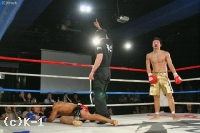 延長R、一気にパンチで前に出ていく秋元。松倉は右ローを蹴っていくが、そこに秋元がバックブロー! これで松倉がバランスを崩して鼻から出血。ピンチを迎えた松倉だったが、逆にここから前に出て右ストレートでダウンを奪う! 再開後、松倉は右ストレート、飛びヒザ蹴りと猛ラッシュ。秋元もバックブローを狙うが、バランスを崩して倒れてしまう。すぐに立ち上がることが出来ない秋元を見て、レフェリーはダウンを宣告。そのままダウンカウントは進み、松倉がKO勝利で延長戦にピリオドを打った。