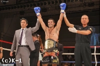 2R、アダマンドポウロスはインローと左ハイキック、そして右ローにつなげる。梶原はその右ローに右ストレートを伸ばす。アダマンドポウロスの右ローが梶原の左足をとらえ、会場からは悲鳴も起こる。梶原も右ストレートから左ボディにつなげるが、アダマンドポウロスも強烈な左ボディを返して、そこから左ハイキック! これが梶原の顔面を打ち抜いて、梶原がバッタリと倒れ、レフェリーが試合をストップ! アダマンドポウロスが梶原をマットに沈め、第2代Krush-63kg級王者となった。試合後、マイクを持ったアダマンドポウロスは「コンニチハ、アリガトウ!」と日本語で挨拶。王座獲得の喜びを爆発させた。