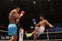 2R、このラウンドも靖仁はロープを背にして立つ。しかし追い込まれた印象はなく、右ローを当て、神保をプッシングてリング中央に出る。リングの真ん中に戻った靖仁は左フック、右ストレートとパンチを放ってヒット。跳びヒザ、左フックと反撃する神保だが、クリーンヒットはないか。終盤の打ち合いは神保の右ストレートを靖仁が頭を振ってかわし右ストレート、左フックと放ってヒットを上げる。