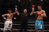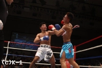 3R、これまで同様にロープを背にして立つ靖仁だが、神保のプレッシャーがきいているか口が開いてやや苦しそうな様子を見せる。飛び込みながらの右フックを当て、プッシングで神保を下がらせんとする靖仁だが、神保は体圧を発して前に出て来る。後ろ回し、ハイキックと大技を見せる靖仁だが神保はやはり下がらず右ストレート、左フックと靖仁に迫り鼻血を出させる。だが、ラウンド最後は靖仁が打ち合いに応じ、右ストレート、左フックと神保に当てて終える。