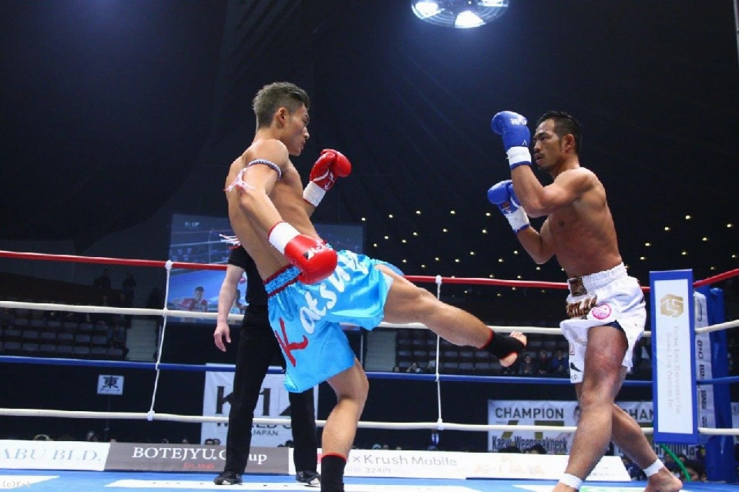 1R、開始から勢いよく出た剛王は、強振した右ストレートから返しで放った左ストレートを当てダウンを奪う。しかしその後は神保がジャブ、ローで出足を止め、剛王を懐に入れさせない。