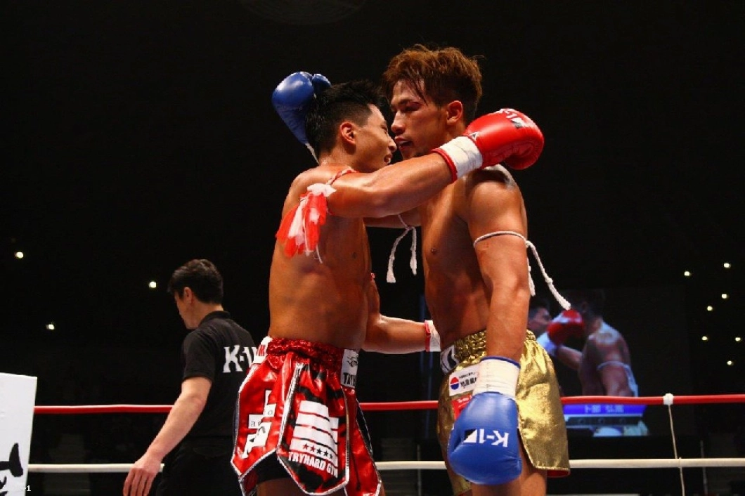 大雅は弘嵩が来たところに合わせる左クロス、そして自ら出てのスーパーマンパンチでダウンを迫る。さらに左強打を連続で振って大雅は弘嵩を倒しに掛かる。勢いの止まらない大雅は左ストレートをさらに当て、右フック、アッパー、跳びヒザと襲うが、何とか弘嵩が乗り切る1Rを終える。